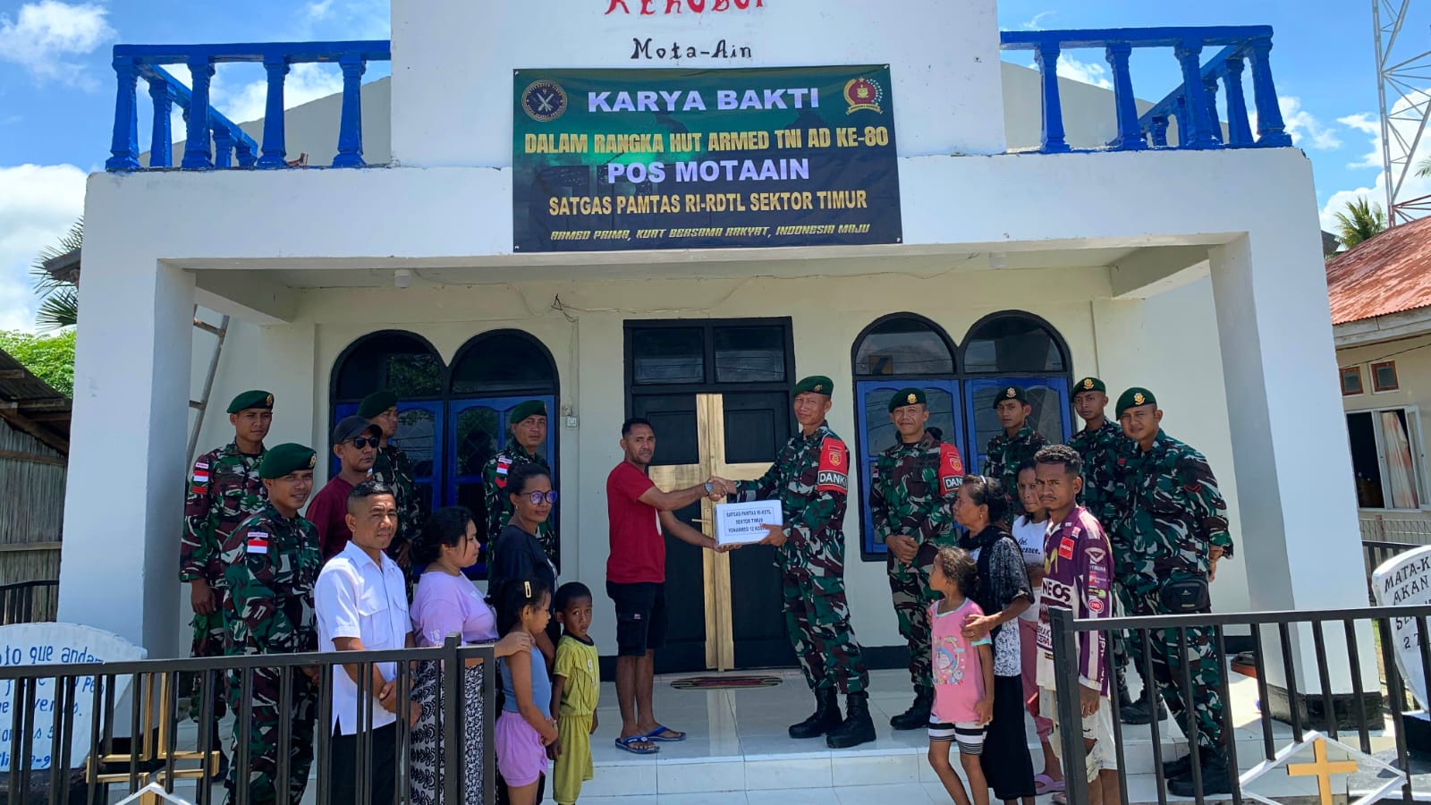 Belu, www.jatimkukini.com – Dalam rangka memperingati Dirgahayu ke-80 Armed, Satgas Pamtas RI–RDTL Sektor Timur Yonarmed 12 Kostrad Pos Motaain melaksanakan karya bakti sosial di Gereja Desa Silawan, Kecamatan Tasifeto Timur, Kabupaten Belu, Nusa Tenggara Timur.