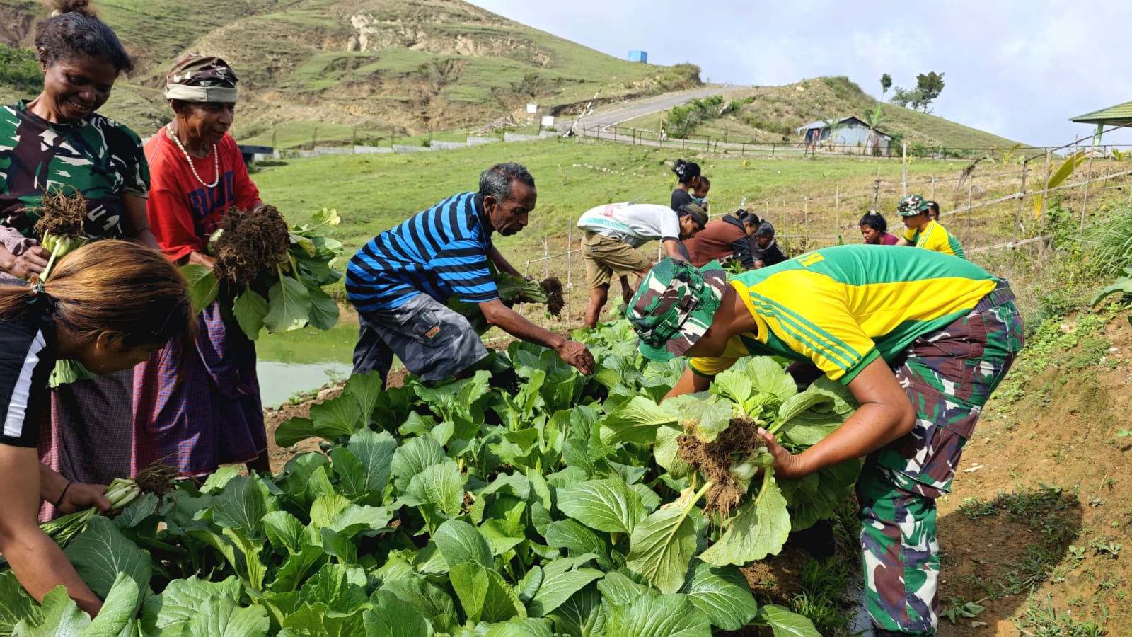 Dalam kegiatan tersebut, personel Pos Fohuk memberikan penyuluhan Hanpangan (Ketahanan Pangan) mulai dari teknik bercocok tanam sederhana, pemeliharaan tanaman, hingga pemanfaatan lahan pekarangan. Antusias masyarakat terlihat dari tingginya partisipasi warga yang hadir dan ikut serta dalam proses panen sayuran hasil kebun binaan Satgas.