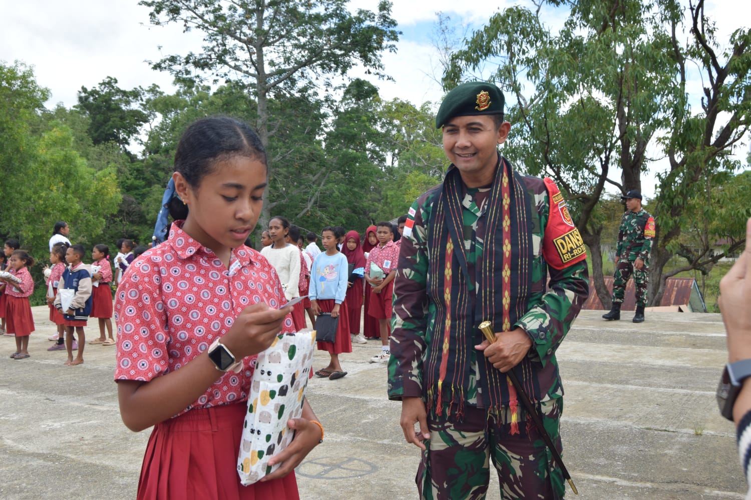 Dansatgas Pamtas menyampaikan, “Di pundak anak-anak sekolah inilah masa depan Indonesia berada. Mereka harus terus belajar dan memperkaya diri dengan ilmu dan pengetahuan, dalam momen ini kami memberikan dukungan berupa alat tulis sebanyak 300 paket. Harapannya ini dapat meningkatkan semangat bagi siswa-siswi SD di perbatasan.