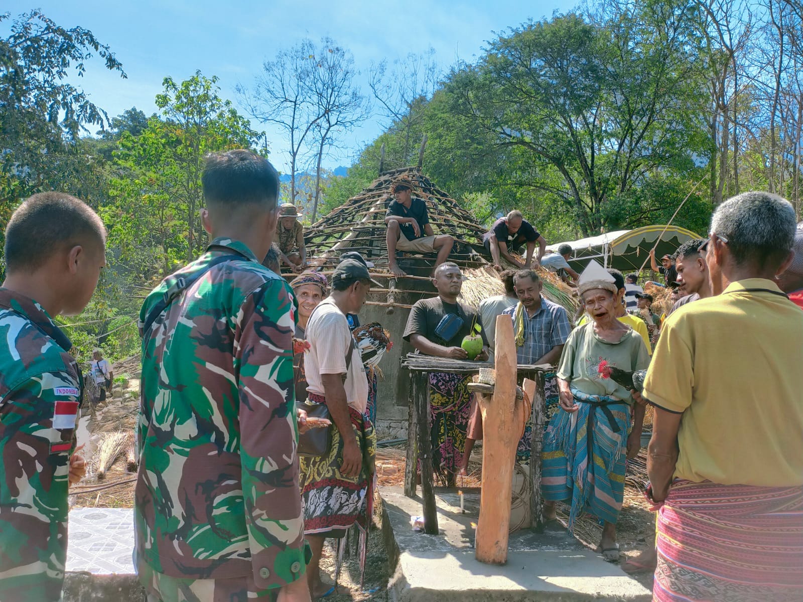 Kegiatan karya bakti ini difokuskan pada pemasangan atap rumah adat yang terbuat dari ilalang, sebagai ciri khas bangunan tradisional setempat. Personel Pos Manamas bersama warga secara bahu-membahu mengangkat dan menata bahan atap tersebut dengan penuh semangat dan kebersamaan.