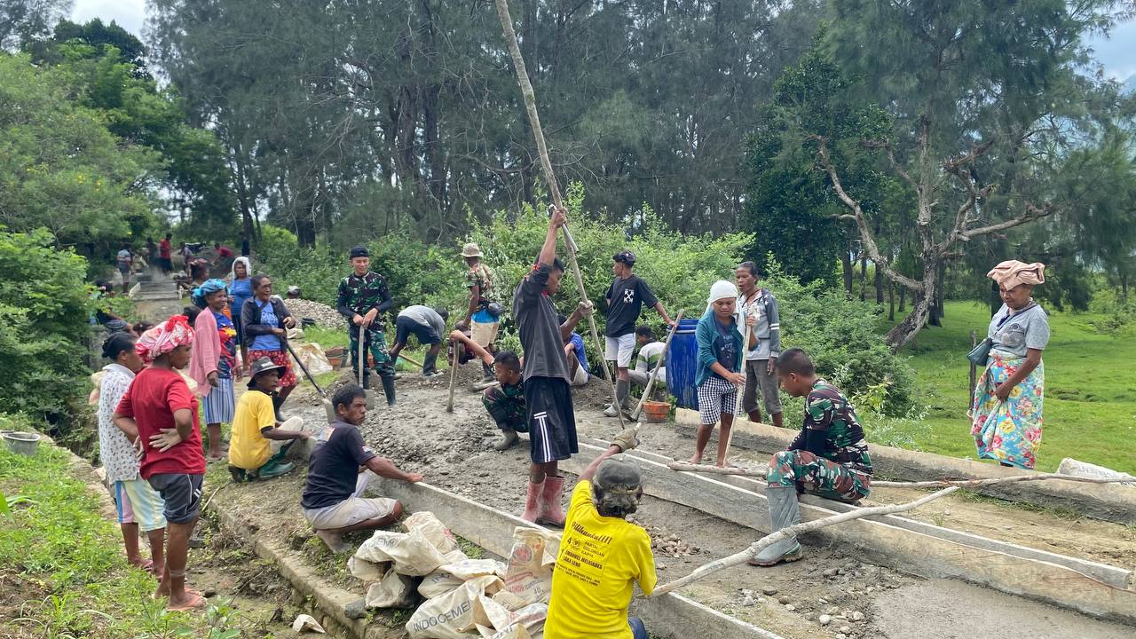 TTU, www.jatimkukini.com – Satgas Pamtas RI-RDTL Sektor Barat Yonarhanud 2 Kostrad Pos Nilulat bersama warga masyarakat melaksanakan gotong royong memperbaiki jalan dengan pengecoran di Desa Nilulat, Kecamatan Bikomi Nilulat, Kabupaten TTU, Selasa (30/12/2025).