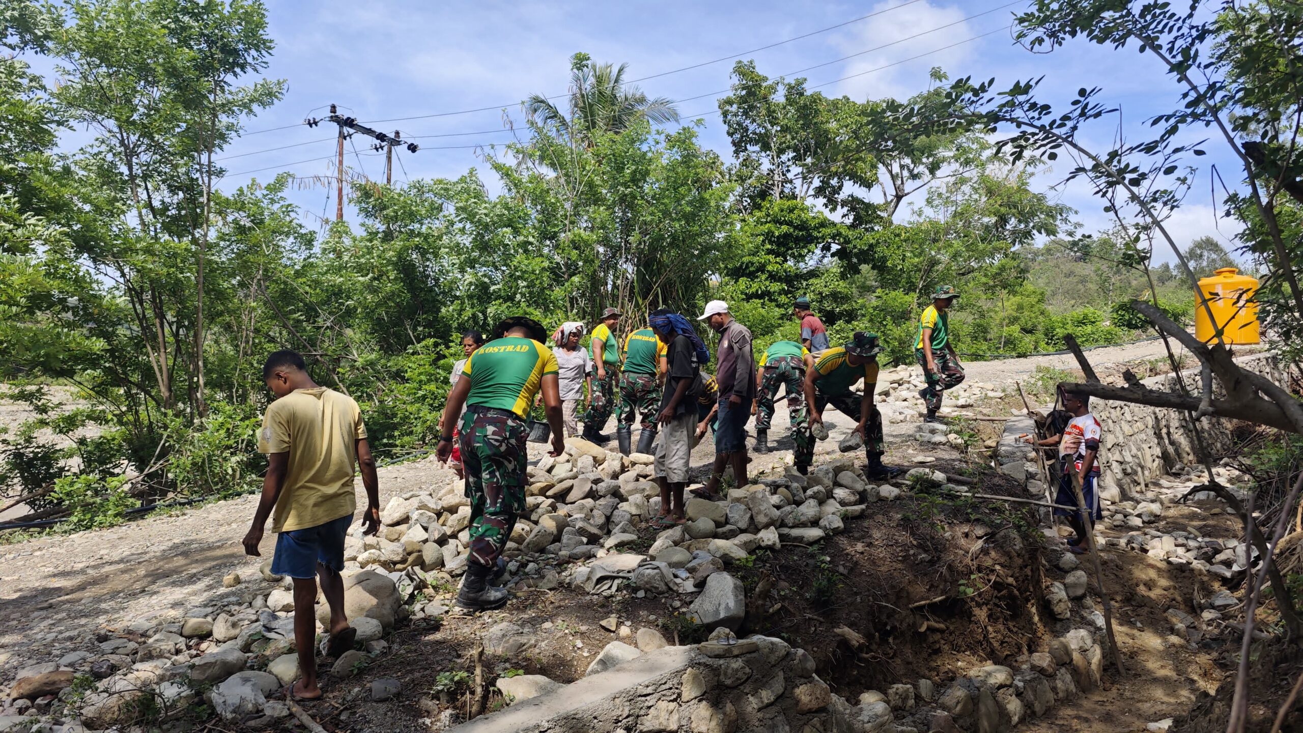 Personel Pos Fohuk bersama warga setempat bekerja sama memperkuat struktur tanggul dengan material yang tersedia agar jalur transportasi tetap aman dan dapat dilalui kendaraan. Jalan Trans Log merupakan akses vital bagi aktivitas masyarakat, terutama dalam distribusi hasil pertanian dan kebutuhan sehari-hari.