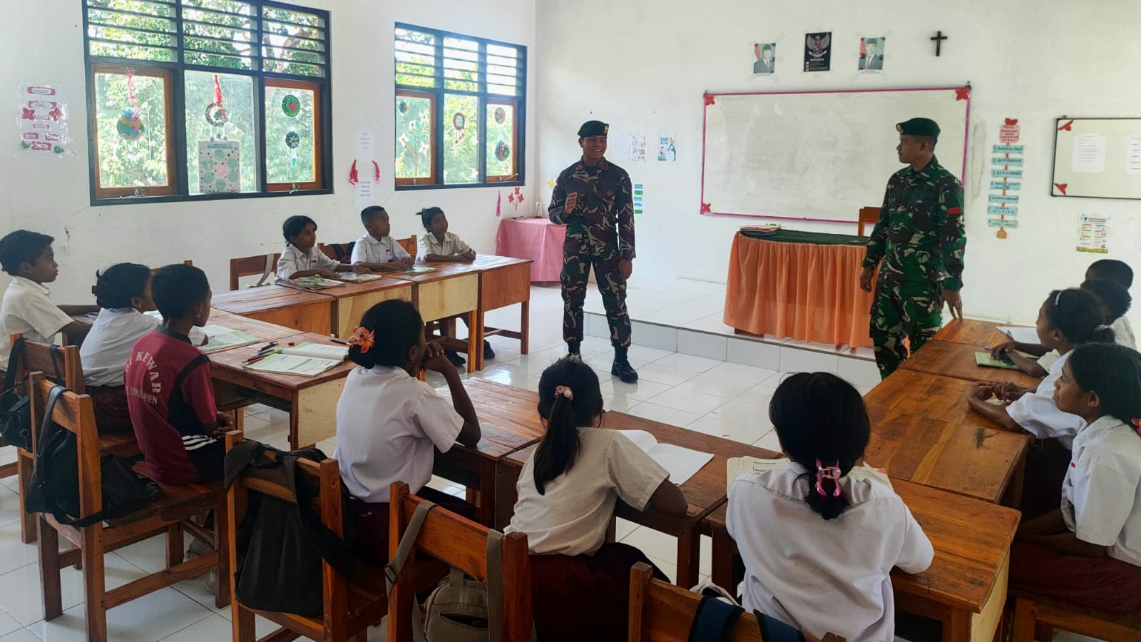 Dalam kegiatan tersebut, prajurit Satgas membantu guru setempat memberikan pelajaran umum, wawasan kebangsaan, serta menanamkan nilai-nilai kedisiplinan dan cinta tanah air. Anak-anak tampak antusias dan gembira belajar bersama para prajurit, yang dikenal dekat dan peduli terhadap masyarakat sekitar.