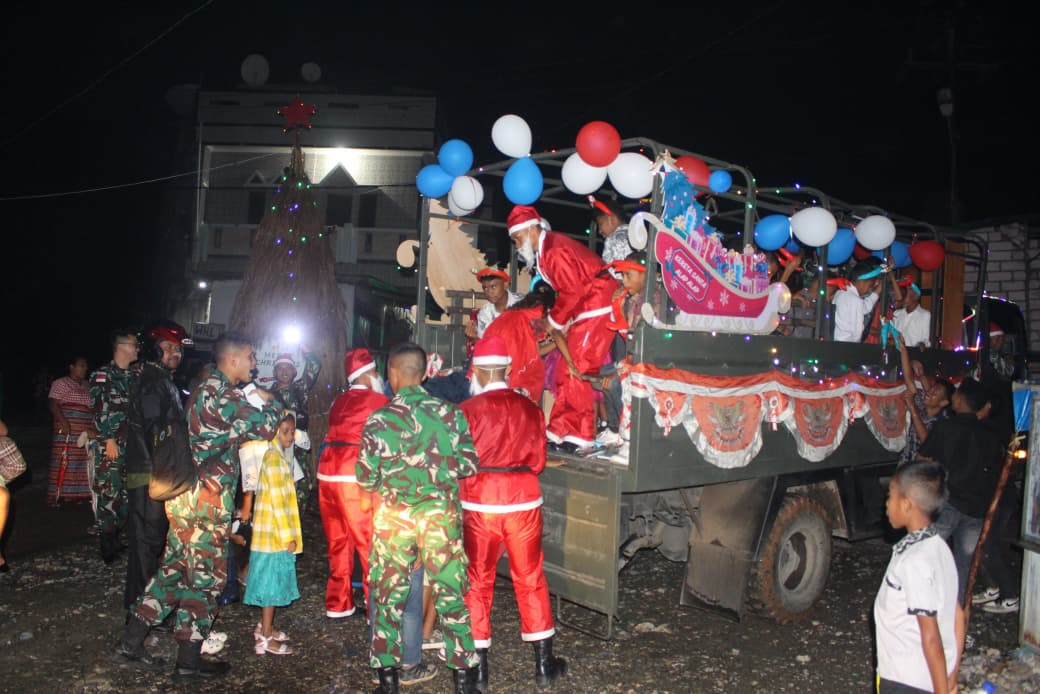 TTU, www.jatimkukini.com – Suka cita dan kebersamaan pada malam Natal di perbatasan, Satgas Pamtas RI-RDTL Sektor Barat Yonarhanud 2 Kostrad hadirkan Kereta Santa Keliling dan Santa Claus di Makosatgas Pamtas, Desa Eban, Kecamatan Miomaffo Barat, Kabupaten TTU, Rabu (24/12/2025).