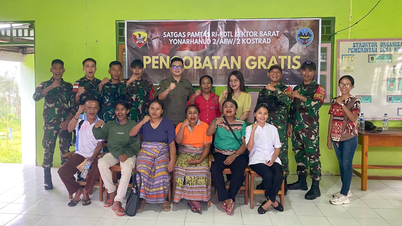 TTU, www.jatimkukini.com – Tim Kesehatan Makosatgas Pamtas RI-RDTL Sektor Barat Yonarhanud 2 Kostrad bersama Pos Nilulat yang berkolaborasi dengan Yayasan Tangan Pengharapan mengadakan Pengobatan Gratis bagi masyarakat di sekitar Pos Nilulat, Kecamatan Bikomi Nilulat, Kabupaten TTU, Kamis (11/12/2025).
