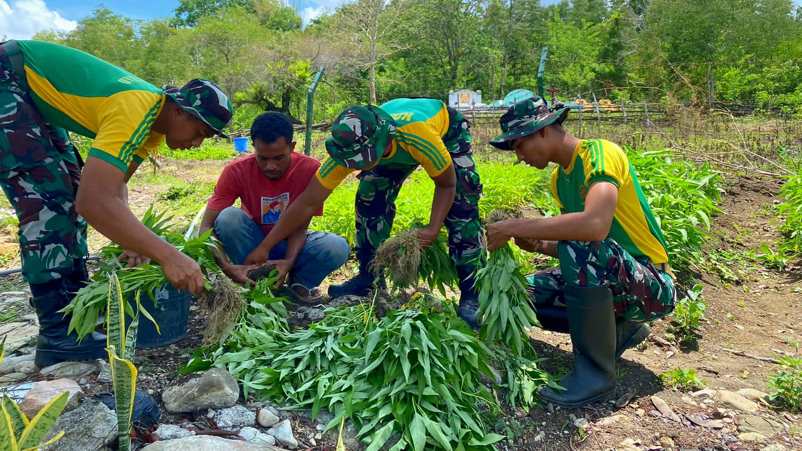 Belu, www.jatimkukini.com — Prajurit Pos Dafala Satgas Pamtas RI-RDTL Yonarmed 12 Kostrad melaksanakan kegiatan pembinaan teritorial (Binter) berupa panen bersama masyarakat di lahan sayur milik Pos Dafala yang berlokasi di Desa Dafala, Kecamatan Tasifeto Timur, Kabupaten Belu, NTT. Kegiatan ini menjadi wujud nyata kepedulian TNI terhadap upaya peningkatan ketahanan pangan di wilayah perbatasan.
