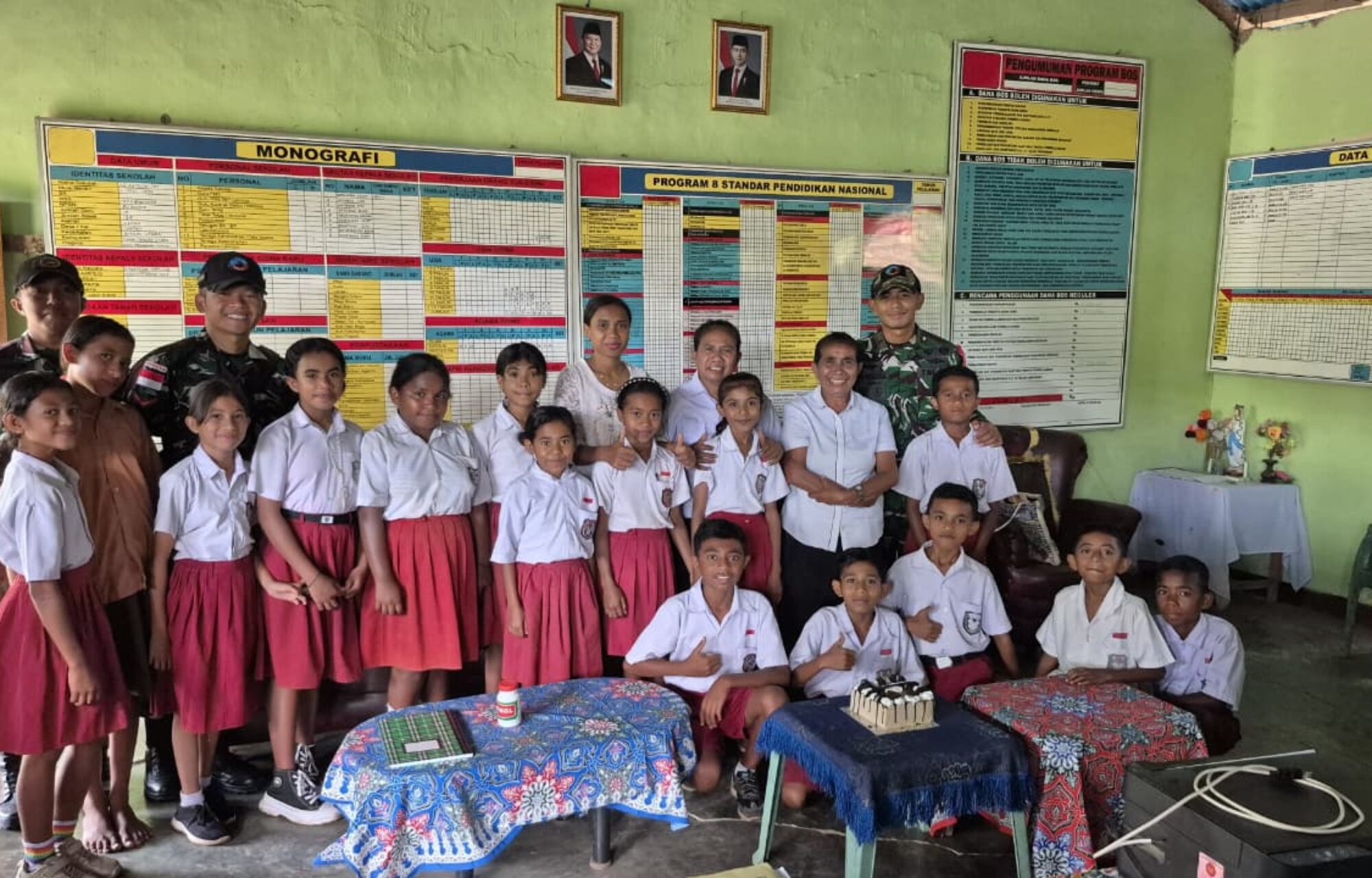 Satgas Pamtas Yonarhanud 2 Kostrad Peringati Hari KORPRI Berikan Bingkisan untuk Guru di Perbatasan