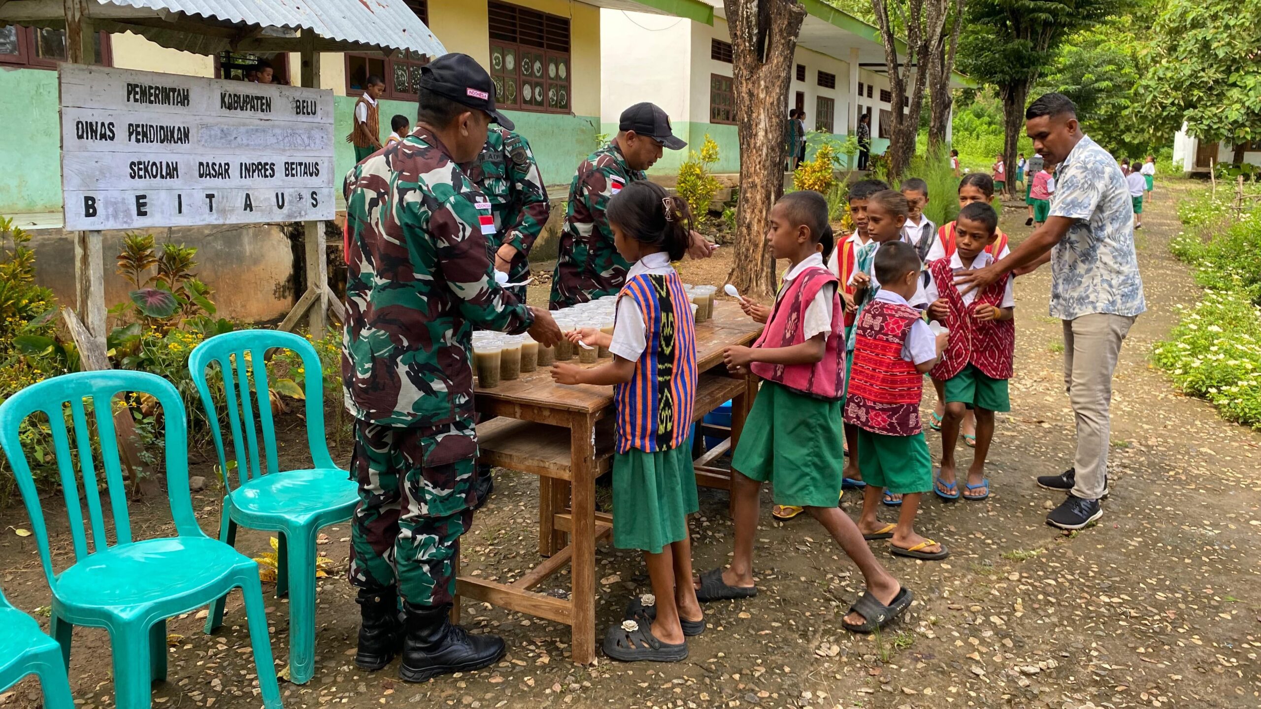Belu, www.jatimkukini.com – Satgas Pamtas RI–RDTL Sektor Timur Yonarmed 12 Kostrad melalui Pos Maubusa melaksanakan kegiatan pembagian bubur kacang hijau kepada siswa-siswi SD Beitaus yang berlokasi di Asumanu, Kecamatan Raihat, Kabupaten Belu, Nusa Tenggara Timur, Senin (2/2/2026). Kegiatan ini merupakan bentuk kepedulian TNI terhadap pemenuhan gizi anak-anak sekolah di wilayah perbatasan RI–RDTL.